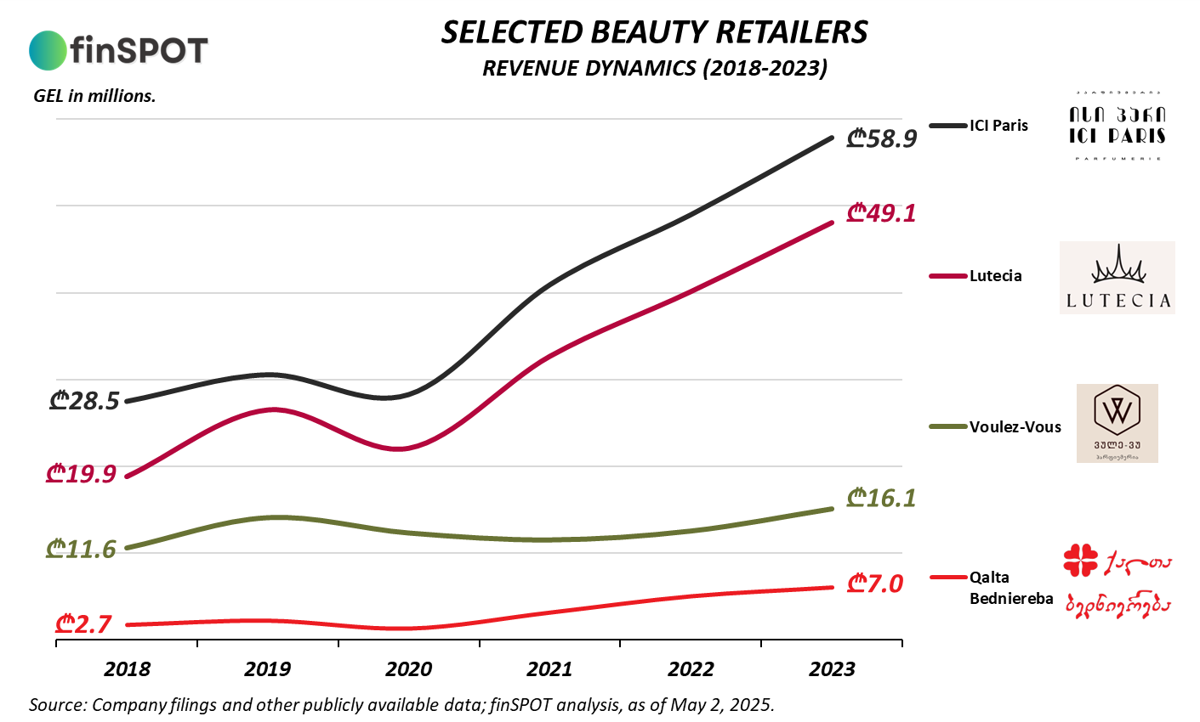 სილამაზის საცალო ვაჭრობის სექტორი საკმაოდ სწრაფად მზარდია. წარმოდგენილი კომპანიების ჯამური შემოსავალები 5 წელში ორჯერ და მეტჯერ გაიზარდა და ₾131 მილიონი შეადგინა 2023 წელს (2018: ₾63 მილიონი). კომპანიების სწრაფ ზრდაში მნიშვნელოვანი როლი ითამაშა სარეალიზაციო მარჟების ზრდამ. 2018-23 წლებში, კომპანიების საერთო მოგების მარჟა (gross profit margin) საშუალოდ 10 პროცენტული პუნქტით გაიზარდა.