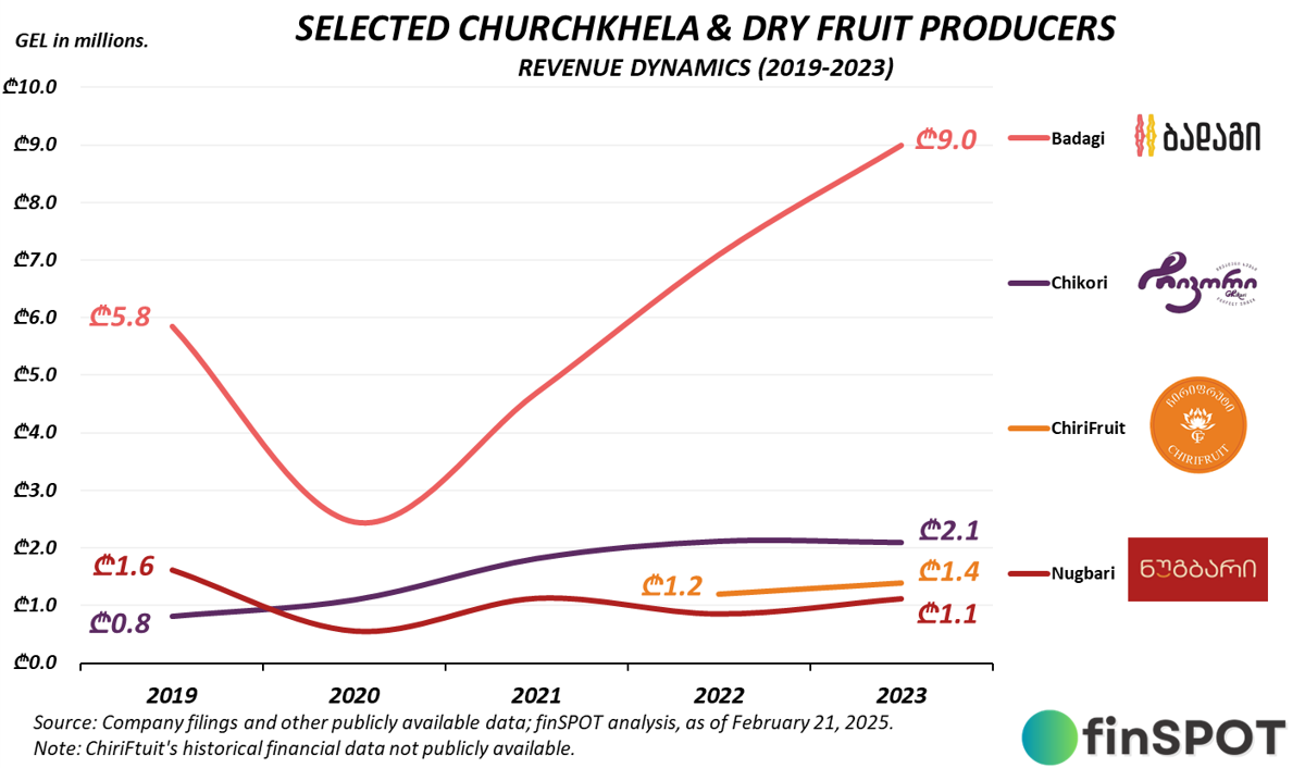 წარმოდგენილ კომპანიებს შორის, “ბადაგი” ქვეყნის ყველაზე მაღალშემოსავლიანი ჩურჩხელის მწარმოებელი კომპანიაა. 2023 წელს კომპანიის შემოსავლებმა ₾9 მილიონი შეადგინა, რაც 27% და 54%-ით აღემატებოდა 2022 და 2019 წლის ბრუნვებს, შესაბამისად.