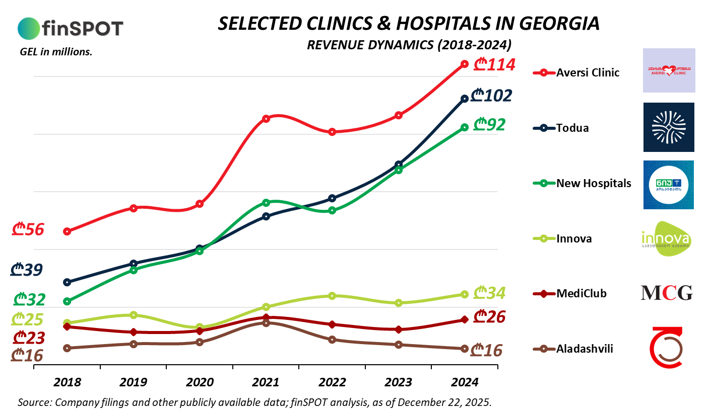 2024 წელს “ავერსის კლინიკის” შემოსავალმა ₾114 მილიონი შეადგინა, “თოდუას კლინიკის” — ₾102 მილიონი, ხოლო “ნიუ ჰოსპიტალსის” — ₾92 მილიონი. ამავე პერიოდში, წარმოდგენილი საშუალო ზომის კლინიკების შემოსავლები ₾15-₾35 მილიონის ფარგლებში მერყეობდა.