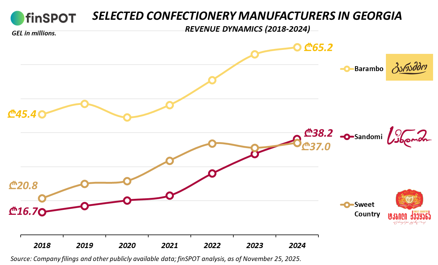 2024 წელს “ბარამბოს” შემოსავლებმა ₾65 მილიონი შეადგინა, მაშინ როცა “სანდომისა” და “ტკბილი ქვეყნის” ბრუნვები ₾38 და ₾37 მილიონს გაუტოლდა, შესაბამისად.