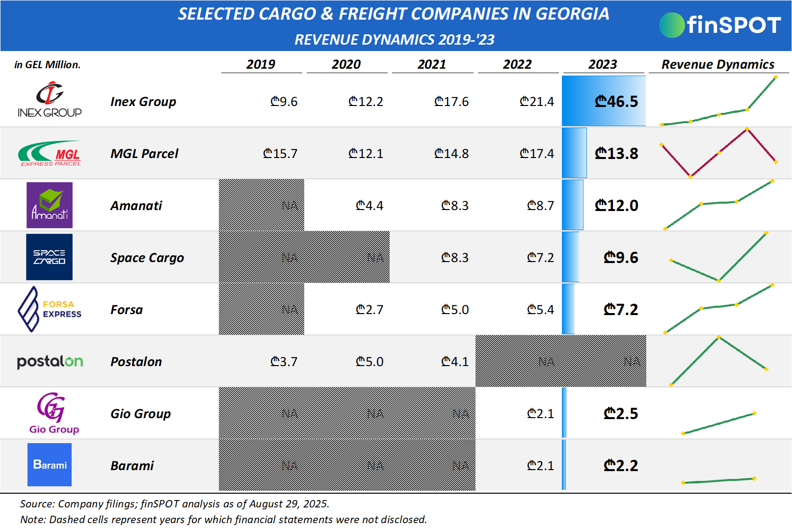 *აღსანიშნავია, რომ ბაზრის მსხვილი მოთამაშე USA2GEORGIA ანალიზში ვერ მოხვდა, რადგან კომპანიის ბოლო ფინანსური ანგარიშგება 2018 წელს გამოქვეყნდა. ასევე, შპს „ფოსტალონის“ (Postalon) ბოლო საჯარო ანგარიში 2021 წლით თარიღდება, როდესაც შემოსავლებმა ₾4.1 მილიონი შეადგინა. უახლესი მონაცემების არქონის გამო აღნიშნული კომპანიები ძირითად ანალიზში არ არის წარმოდგენილი.