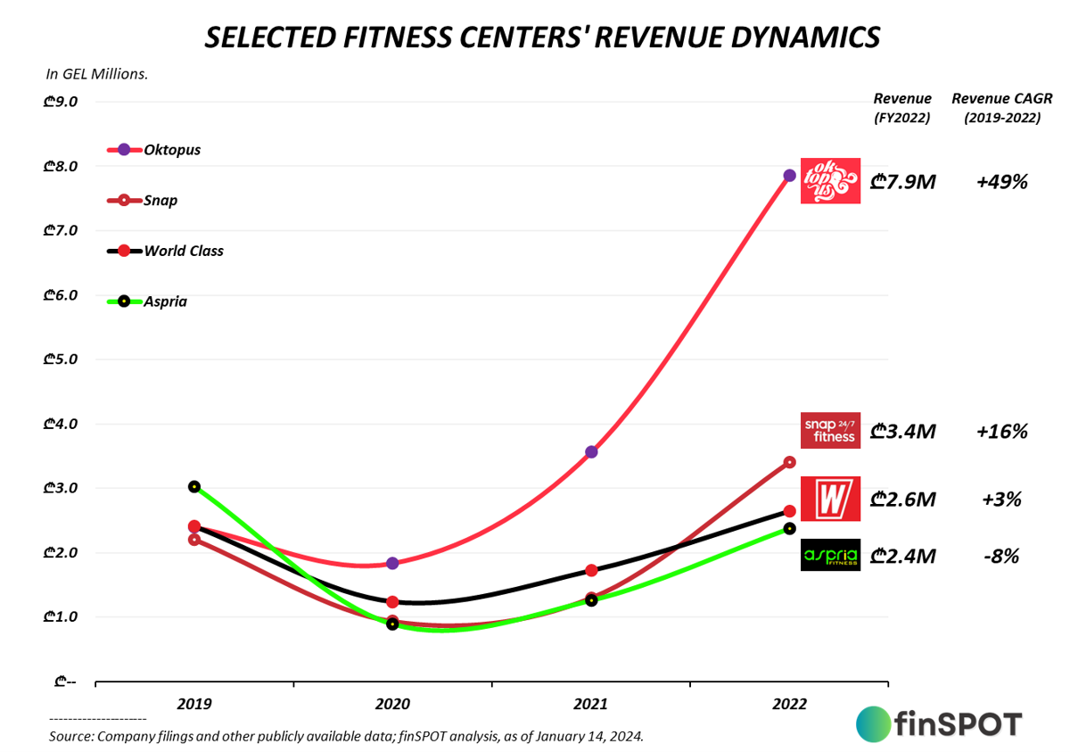 წარმოდგენილ ფიტნეს დარბაზებს შორის, Oktopus ყველაზე მაღალშემოსავლიანი და სწრაფად მზარდი კომპანიაა. “ოკტოპუსის” შემოსავლებმა ₾7.9 მილიონს მიაღწია 2022 წელს, რაც 131%-ით აღემატება Snap Fitness Georgia-ს შემოსავლებს და 3-ჯერ და მეტჯერ World Class Georgia-სა და Aspria Fitness-ის შემოსავლებს.