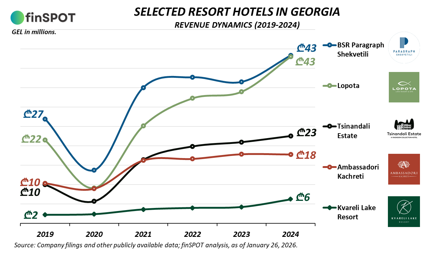 მიმოხილვაში წარმოდგენილ სასტუმროებს შორის შემოსავლებით ლიდერები არიან “პარაგრაფ შეკვეთილი” და “ლოპოტა” — ორივე დაახლოებით ₾43 მილიონიანი ბრუნვით. 2019-2024 წლებში ორივე მოთამაშე საშუალოდ 10%-15% ტემპით იზრდებოდა, თუმცა ზრდის მექანიკა ფუნდამენტურად განსხვავებულია.