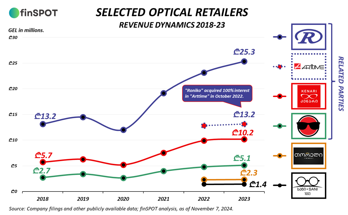 ოპტიკურ ბაზარზე უპირობო ლიდერია “რონიკო” და მასთან დაკავშირებული 2 ოპტიკური კომპანია – “კენარი” და “ოპტიმისტი“. სამივე კომპანია ეკუთვნის ერთ ფიზიკურ პირს ან მის ოჯახის წევრებს.