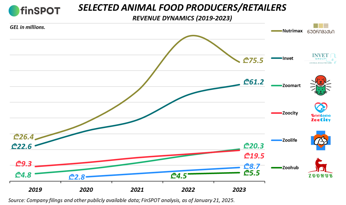 ვინაიდან დანარჩენი 4 კომპანია ძირითადად მხოლოდ შინაური ცხოველების საკვების და მოვლის საშუალებების დისტრიბუცია-რეალიზაციას ეწევა, მათი შემოსავლები ₾5-₾20 მილიონის ფარგლებშია. აქედან, შემოსავლების კუთხით, ყველაზე სწრაფად მზარდი კომპანიაა “ზოომარტი“.
