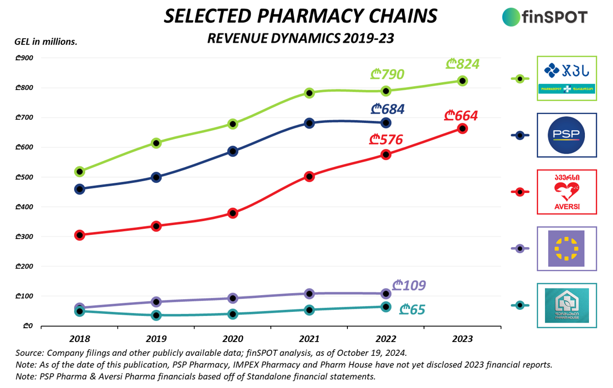 ამ ეტაპისთვის, გასული წლის ანგარიშგება მხოლოდ "გეფას" (ჯპს & ფარმადეპო) და "ავერსის" აქვთ გამოქვეყნებული. ამიტომ, 2023 წელს მხოლოდ მათი შემოსავლებია დატანილი: