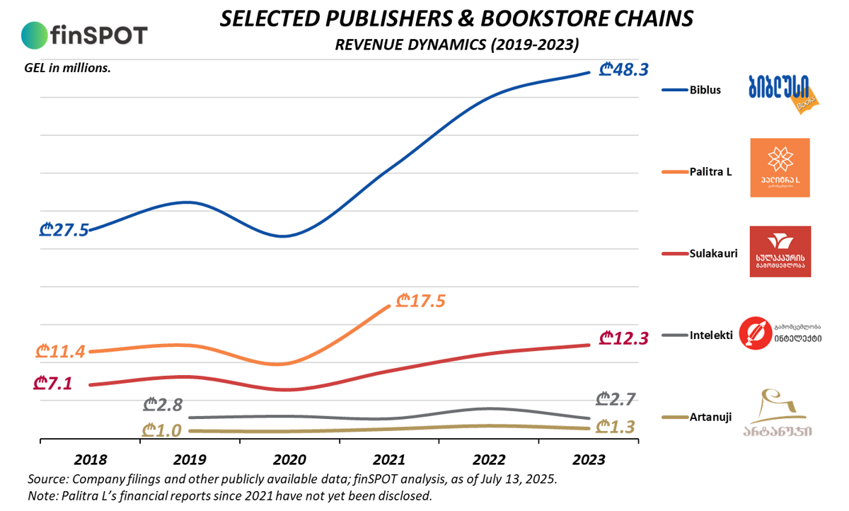 უმსხვილესი წიგნების ქსელური მაღაზიის, “ბიბლუსის“, შემოსავლებმა ₾48 მილიონს მიაღწია და საშუალოდ წლიურად (CAGR) 12%-ით იზრდებოდა. გაყიდვების თითქმის 90% საცალო სეგმენტზე მოდის: აქედან წიგნები შეადგენს 55%-ს (₾24 მილიონი), საკანცელარიო საქონელი – 34%-ს (₾15 მილიონი), ხოლო დანარჩენი 11% სხვა პროდუქტებზე ნაწილდება (სათამაშოები, ჟურნალები და სხვა).