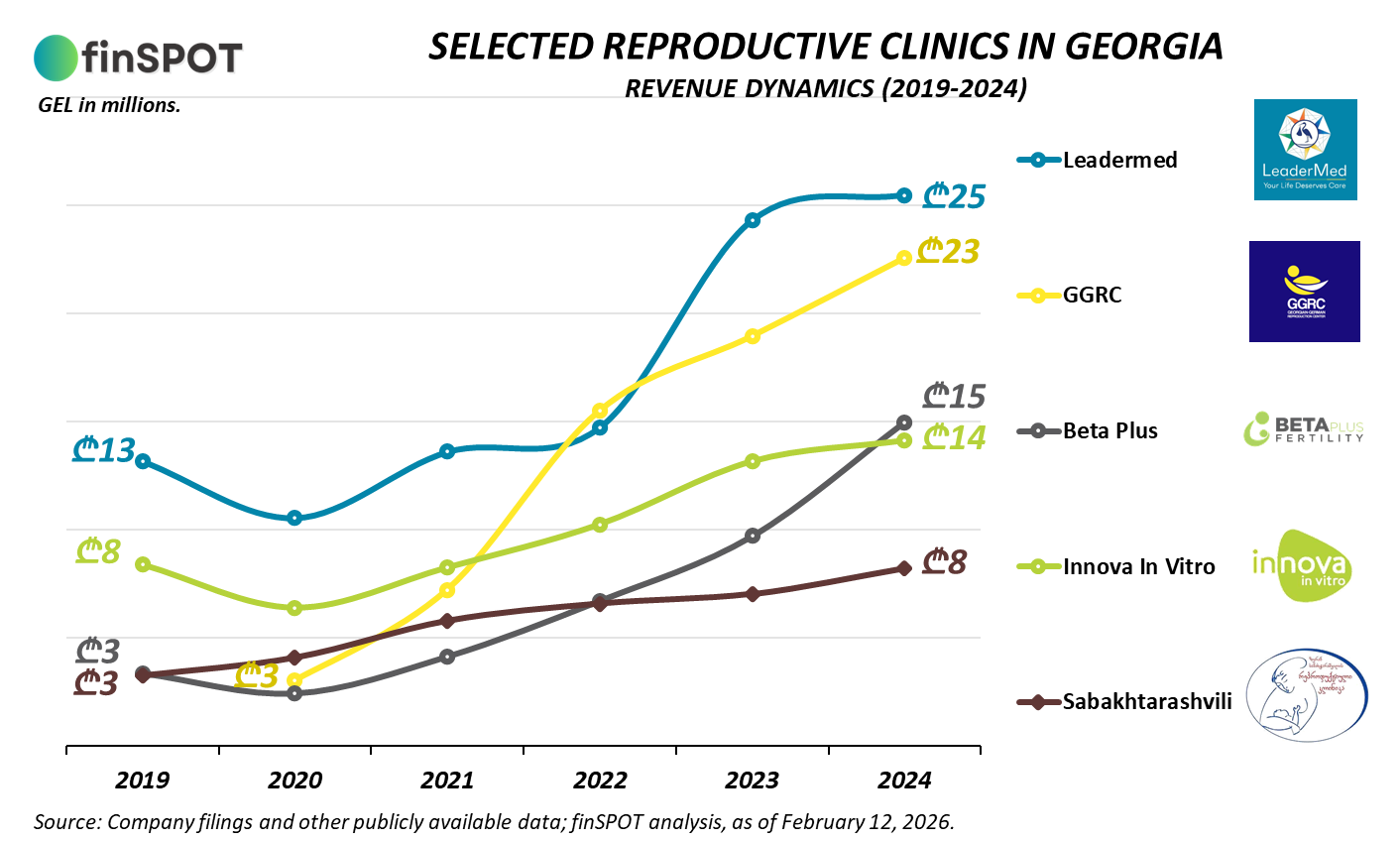 ზრდის ტემპით ყველაზე გამორჩეულია “GGRC“. 2019 წელს დაფუძნებულმა კლინიკამ 2020 წელს ~₾3 მილიონი ბრუნვიდან 2024 წლისთვის ₾22.6 მილიონამდე მიაღწია (4-წლიანი CAGR: ~65%). სწრაფად გაიზარდა “ბეტა პლუს ფერტილიტიც“: კომპანიამ 2019 წლის ₾3.4 მილიონიდან 2024 წელს ₾15.0 მილიონამდე გაზარდა შემოსავლები (5-წლიანი CAGR: ~35%).