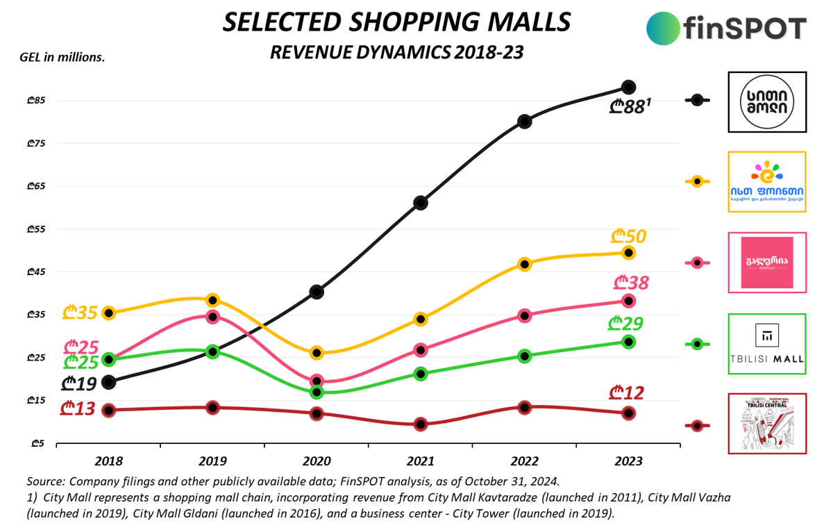 სავაჭრო ცენტრების შემოსავლების დინამიკა ისტორიულ ჭრილში. ბოლო 5 წელში (2018-23), სავაჭრო ცენტრების საშუალო წლიური ზრდა (CAGR) შემდეგნაირად გამოიყურება: