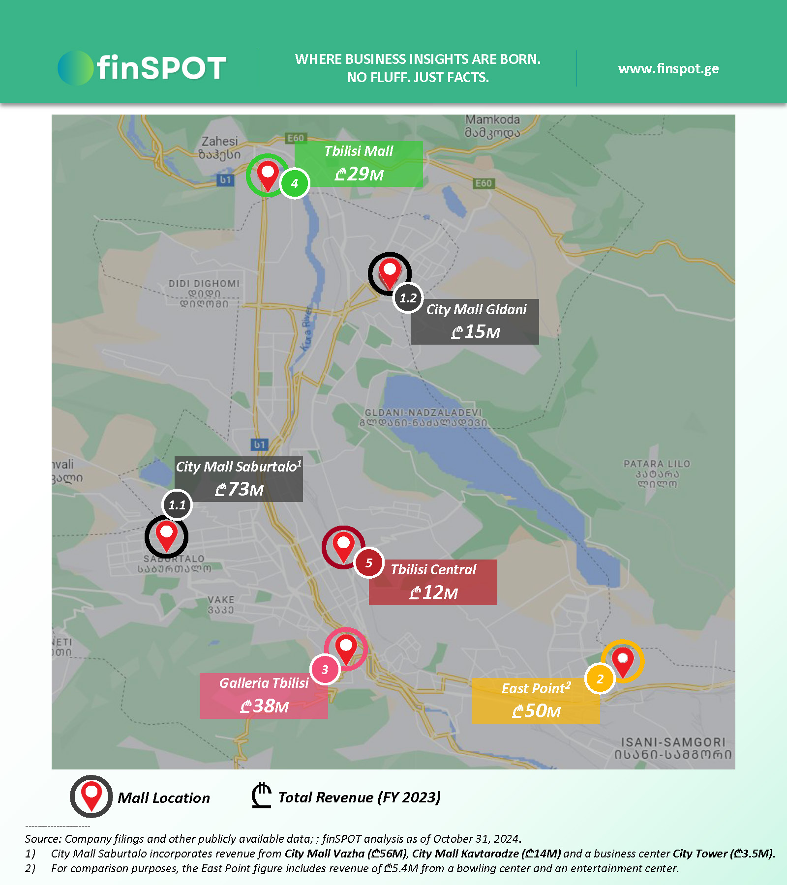 2023 წელს ხუთივე მოლის საიჯარო და მასთან დაკავშირებულმა შემოსავლებმა ჯამურად ₾217 მილიონი შეადგინა. ამ შემოსავლის 41%-ი IG Development-ზე (City Mall • სითი მოლი) მოდის, რომელიც 3 მოლს და ბიზნეს ცენტრს აერთიანებს: “სითი მოლ ვაჟა”, “სითი მოლ ქავთარაძე”, “სითი მოლ გლდანი” და A კლასის ბიზნეს ცენტრი City Tower • სითი თაუერი.