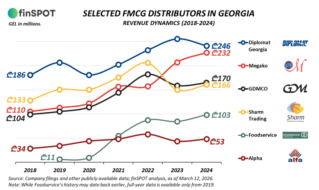 2024 წლის მონაცემებით, განხილული ექვსი კომპანიის შემოსავლები ₾53 მილიონიდან ₾246 მილიონამდე მერყეობს. თითოეული მათგანის შემოსავლების ძირითად ნაწილს FMCG პროდუქციის რეალიზაცია წარმოადგენს.