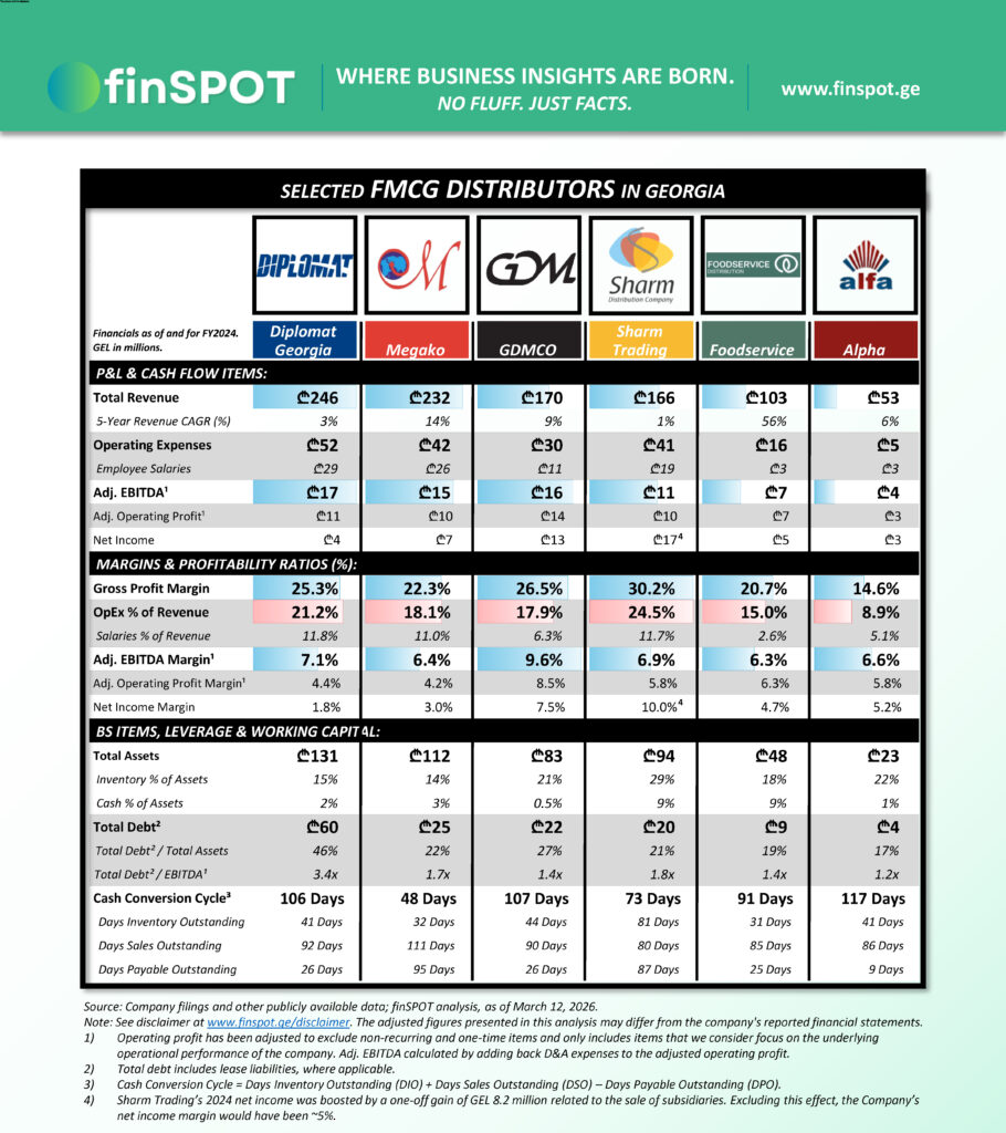 შენიშვნა: ერთ-ერთი უმსხვილესი მოთამაშე, “ლაქტალის ჯორჯია“, ანალიზში არ არის შეტანილი, რადგან მისი შემოსავლების მნიშვნელოვანი ნაწილი დაკავშირებულ მხარეებთან, მათ შორის “სანტესთან“, ოპერაციებს უკავშირდება. ₾289 მილიონიანი ბრუნვიდან, დაკავშირებულ მხარეებთან განხორციელებულმა ტრანზაქციებმა დაახლოებით ₾205 მილიონი შეადგინა, რაც მიანიშნებს, რომ კომპანია უფრო ვერტიკალურად ინტეგრირებული მოდელით მუშაობს და პირდაპირ შესადარისი არ არის განხილული დისტრიბუტორების უმეტესობასთან.