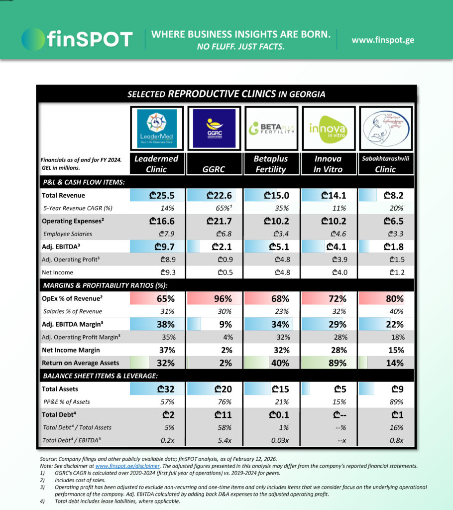 ამ სექტორში ფინანსური ანგარიშგება ყოველთვის სრულად ვერ აჩვენებს კლინიკების შემოსავლიანობის სრულ სურათს. IVF პროგრამებში მედიკამენტები ხარჯების ერთ-ერთი ყველაზე მსხვილი კომპონენტია, და რიგ შემთხვევებში მათი რეალიზაცია კლინიკისგან ცალკე იურიდიული პირის მეშვეობით ხდება. მაგალითად, “ინოვა ინ ვიტროს” მიმდებარედ ოპერირებს აფთიაქი შპს “ჯმფ” (ბრუნვა: ₾9 მილიონი), რაც მიუთითებს, რომ კლინიკის პაციენტებზე მიბმული შემოსავლების ნაწილი შესაძლოა სწორედ ამ არხში ირიცხებოდეს. შესაბამისად, “ინოვა ინ ვიტროს” ₾14 მილიონი ბრუნვა შეიძლება მხოლოდ ნაწილობრივ ასახავდეს კლინიკის რეალურ მასშტაბს.